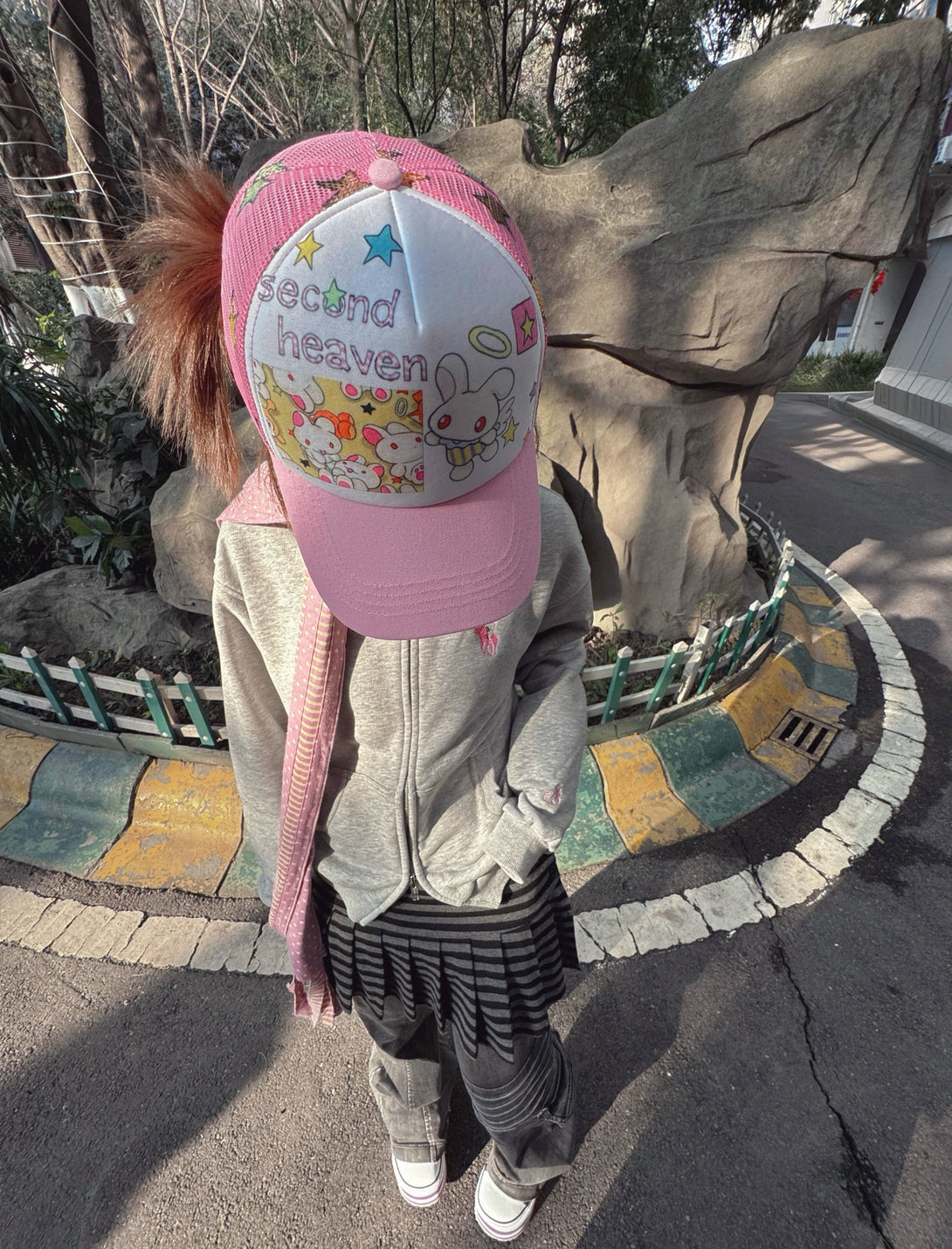 It features cute cartoon bunnies (some with halos and wings), star motifs, and the text “second heaven” on a pink-and-white trucker hat design.