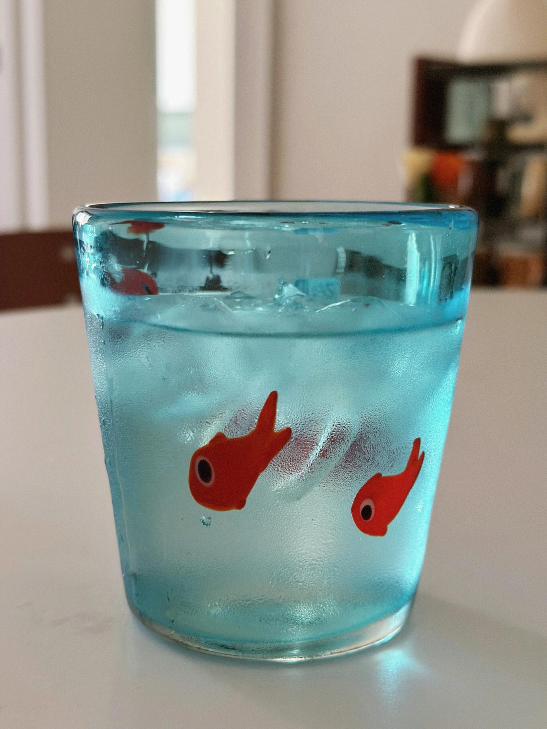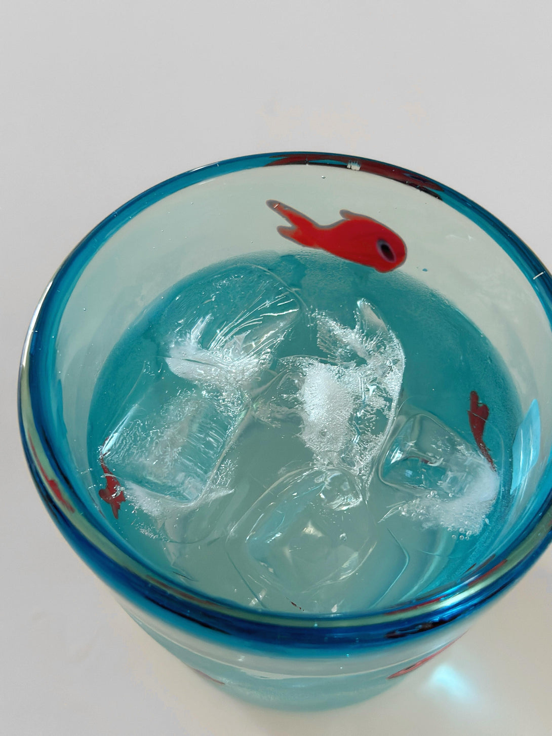 Our whimsical red-fish turquoise glass holds 380ml. Note: It’s non-heat-resistant glass—do not use with hot water, ideal for cold drinks only.